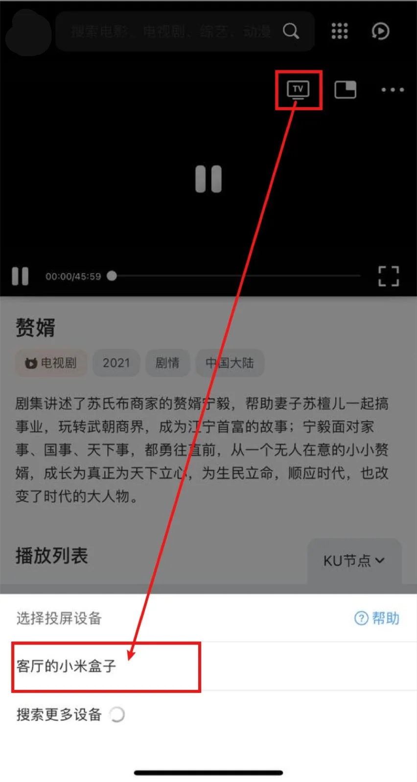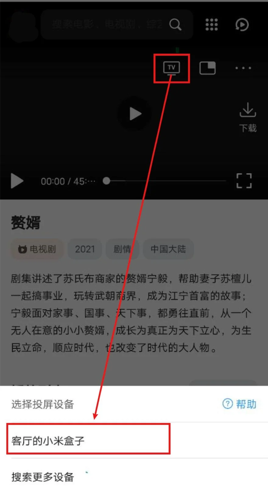 打开QQ浏览器(会接管网页播放器)->打开TV天堂->播放视频->选中投屏图标->等待搜寻出智能电视/电视盒子->选中,即可投屏。
